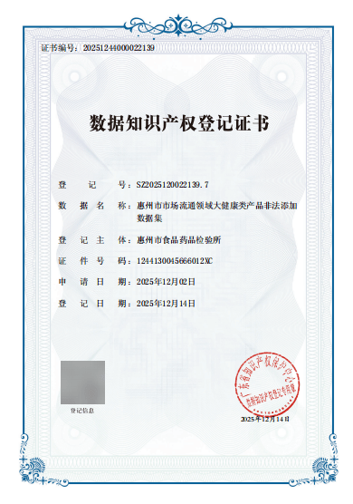 近日,惠州市食物药品查验所申报的“惠州市市场畅通范畴大健康类产物不法添加数据集”成功通过广东省学问产权核心核准登记,成为我市查验检测机构首张“数据学问产权登记证书”,这标记着我所正在数据资产办理取立异使用范畴实现“零”的冲破,正在鞭策查验检测数据要素价值化、赋能聪慧监管的征程中迈出了环节一步。