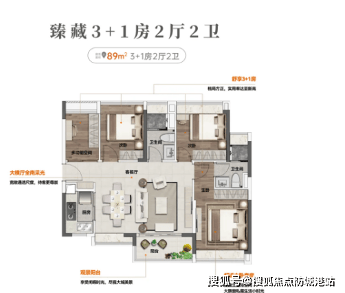 建面约89㎡ 4房2厅2卫户型,款式朴直,可以或许满脚三代同堂一步到位的栖身需求。该户型为单边位,采用南北对流设想,通风结果极佳;大横厅南向采光,不只提拔了室内的采光结果,还让空间显得愈加宽阔;对比周边同面积段户型,该户型多一房且价钱更低,性价比极高。