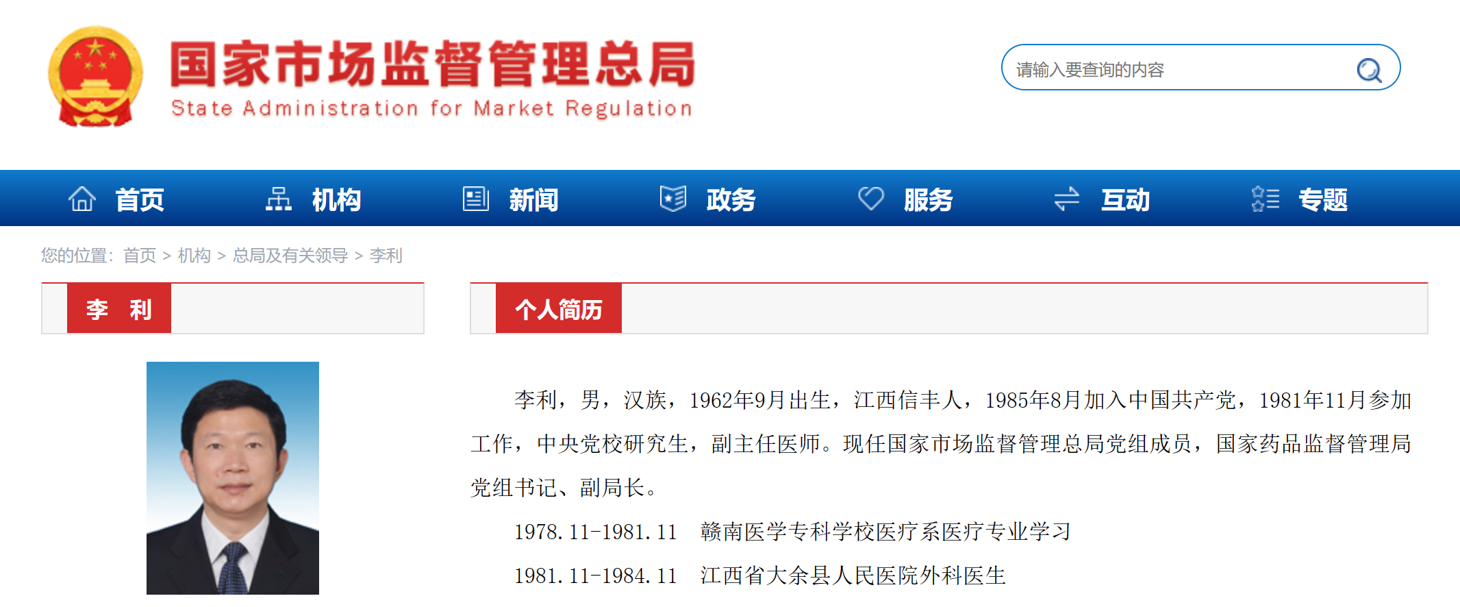 李利,男,汉族,1962年9月出生,江西信丰人,1981年11月加入工做,1985年8月插手中国,现任第十四届全国政协委员、教科卫体委员会委员,国度市场监视办理总局党组,国度药品监视办理局党组、局长。党组,厅曲属机关党委(其间:1997。08-1999。12地方党校函授学院经济办理专业进修)2005。04-2007。03江西省卫生厅副厅长、党组副(其间:2003。09-2006。07地方党校经济学专业退职研究生班进修)2010。03-2013。12江西省卫生厅厅长、党组(其间:2010。09-2011。01地方党校中青年干部培训班进修)2018。03-2023。09国度市场监视办理总局党组,副局长